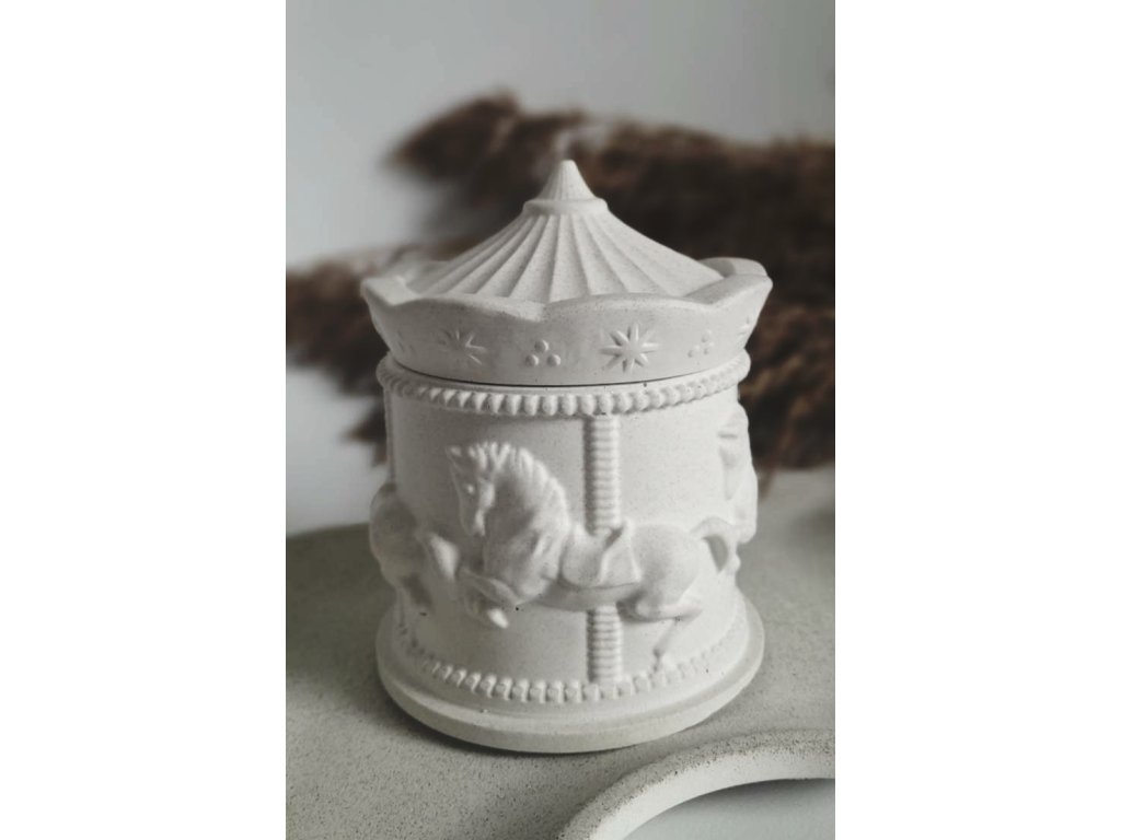 Bílá dóza ve tvaru retro kolotoče se hodí nejen na svíčku, ale i na ukrytí šperků, bonbónů aj.
